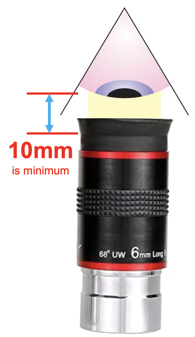 Comfort. An eyepiece having around 20mm of eye relief is very comfortable for viewing with or without eyeglasses. If you don’t need eyeglasses to observe, almost anything below 10mm is too short because you have to shove your eye too close to the top of the eyepiece—this is uncomfortable and your eyelashes might get in the way, too.
