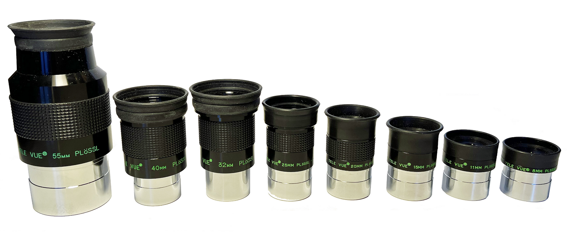 2-inch diameter barrel eyepiece (far left) compared to a family of the more common 1.25-inch diameter barrel eyepieces.