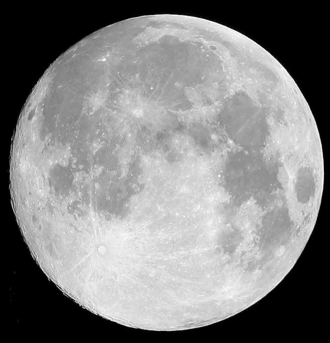 Rays emanating from the southern crater Tycho, and the low contrast, “washed out” look from a full Moon. Tycho is a prominent crater in the southern part of the Moon and represents a more “recent” impact.