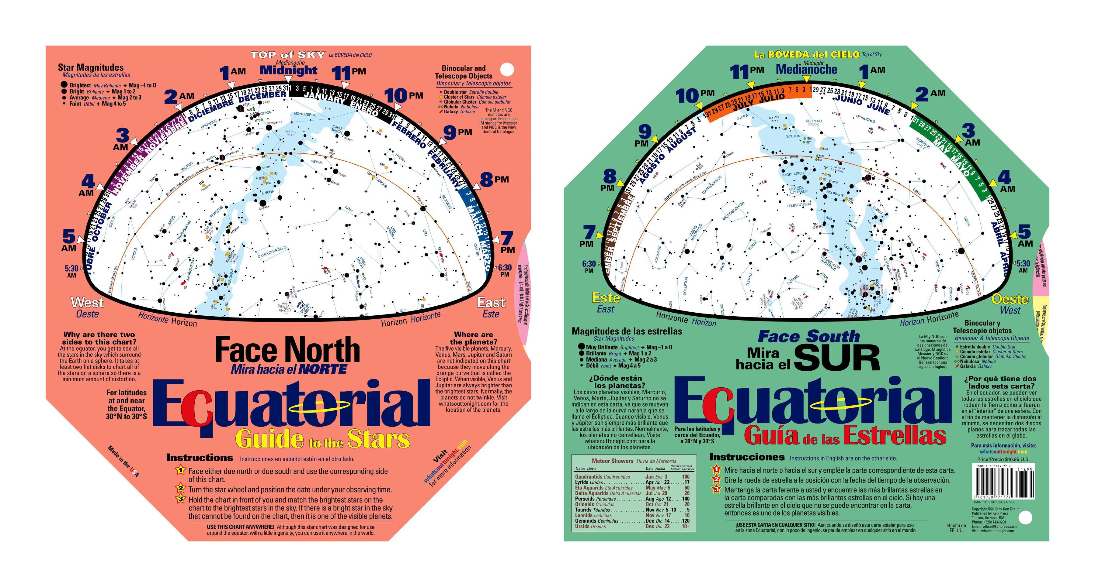 As far as Ken Press knows, this is the only star chart available for use around the equator (20°N to 20°S). The star wheel is visible on both side. You use one side of the chart when facing north and the other side when facing south. Over 80 telescope objects are indicated. The annual meteor showers are also provided. Made of heavy card-like paper that resists moisture.